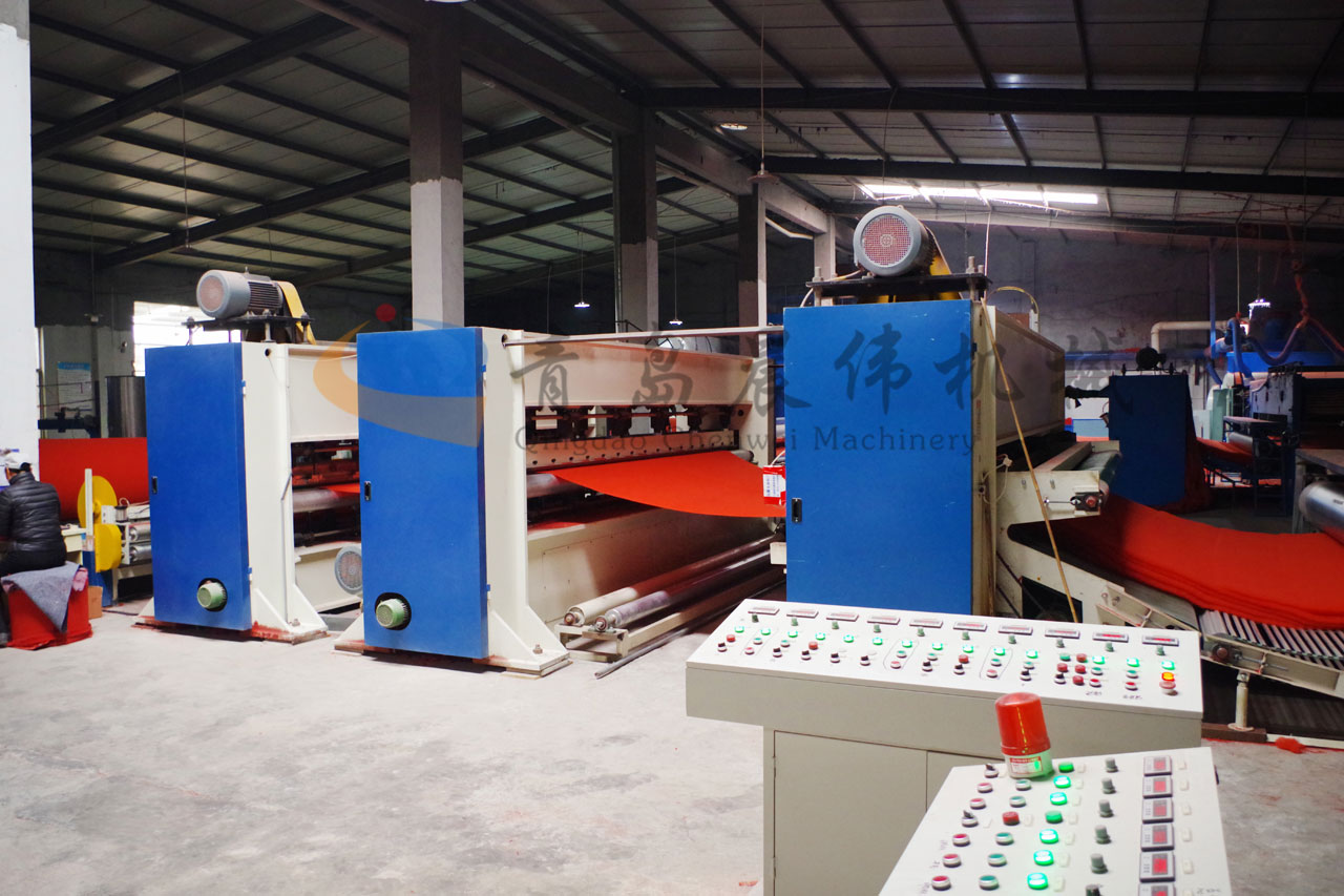 5. CWPW-鋪網(wǎng)機:用于將梳理纖網(wǎng)通過移動小車交叉折疊為所需幅寬和定量的多層纖網(wǎng),以供后道工序使用。鋪網(wǎng)輥采用特殊結(jié)構(gòu),加裝壓網(wǎng)輥和導(dǎo)流板,不飄網(wǎng)不起皺,五只大功率電機精確控制各部件的運動,電動輸出簾高度調(diào)節(jié)裝置