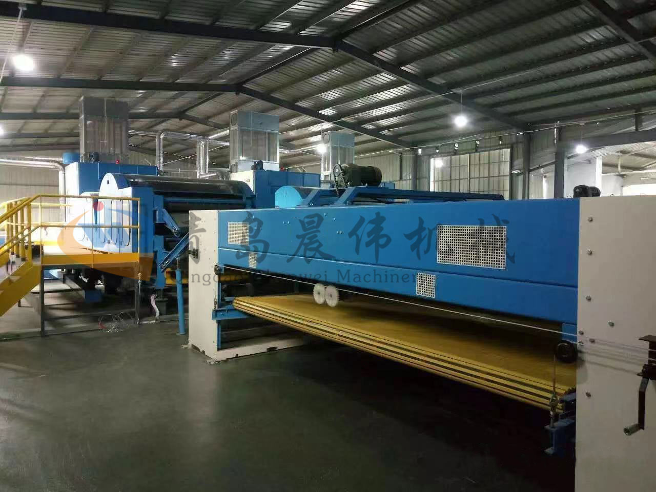 開包機(jī)-開松機(jī)-振動(dòng)給棉機(jī)-梳理機(jī)-鋪網(wǎng)機(jī)-烘房-燙光機(jī)-成卷切片機(jī)