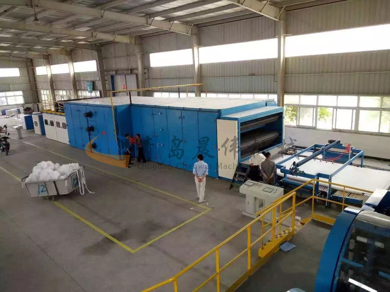 該生產(chǎn)線用于生產(chǎn)高檔家用紡織材料仿絲棉, 仿絲棉廣泛應(yīng)用于服裝、床上用品、家具等。根據(jù)客戶要求可分四機(jī)頭、六機(jī)頭、七機(jī)頭等。機(jī)頭越多,產(chǎn)量越高。
