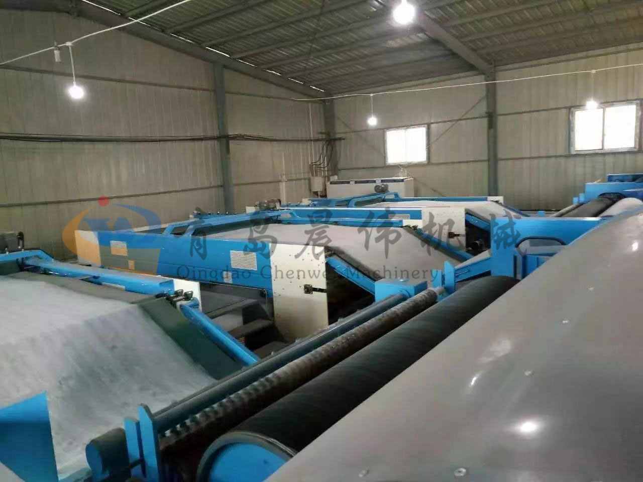5. CWPW-鋪網(wǎng)機:用于將梳理纖網(wǎng)通過移動小車交叉折疊為所需幅寬和定量的多層纖網(wǎng),以供后道工序使用。鋪網(wǎng)輥采用特殊結(jié)構(gòu),加裝壓網(wǎng)輥和導(dǎo)流板,不飄網(wǎng)不起皺,五只大功率電機精確控制各部件的運動,電動輸出簾高度調(diào)節(jié)裝置